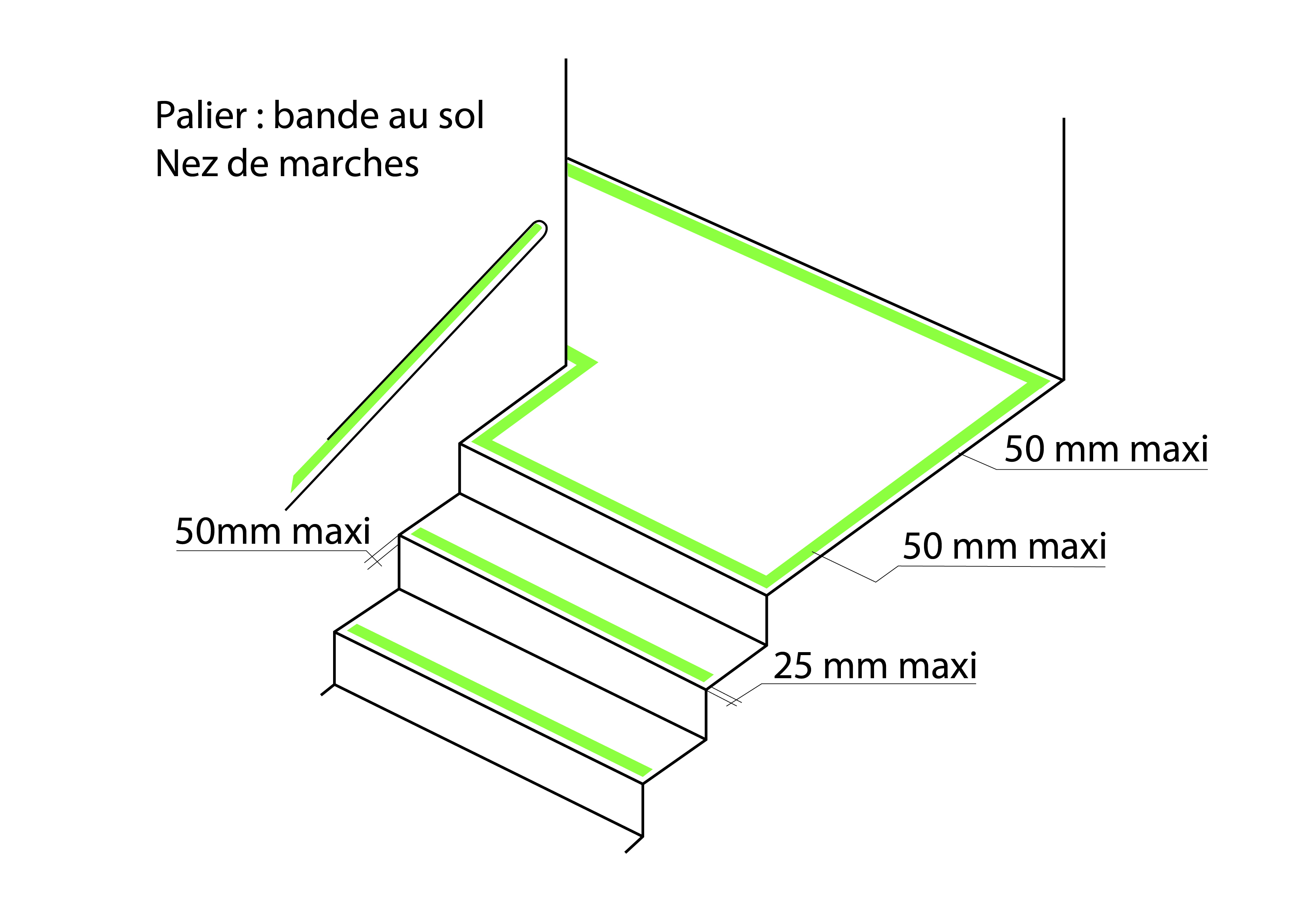 Chaque marche doit être signalée par une bande de 20 à 50 mm de largeur, posée sur toute la longueur de la marche.